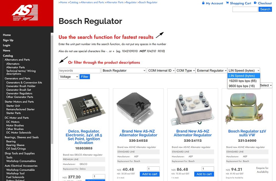 AS Group NZ's customised search engine for their parts database can be filtered by specifications that are contextually relevant to the category. In the example screenshot above, the search results for a Bosch Regulator are displayed. There are over 800 different specification types, but only four are relevant to Bosch regulators and these are shown in the above screenshot. From here, the customer can use these specifications to further narrow down their product selection.