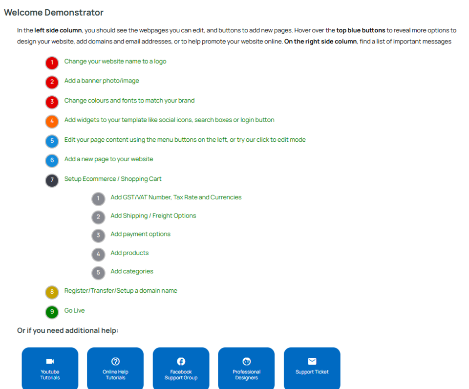 Here are our step by step instructions for designing a website with Website World, as seen on your Welcome Dashboard: