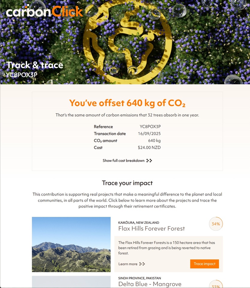 The carbon footprint for our office, driving, flying, rubbish, etc was calculated with an estimation tool from CarbonClick. In actual fact we use 100% renewal energy from Mercury Energy, and drive an EV. So our actual footprint is much less than what is estimated.