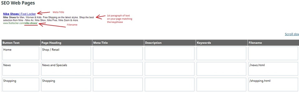 In your CMS, you will find the area to enter your meta tags under the blue SEO button and then either your Web Pages, Categories or Blog Meta Tag option. Below is an example of both what meta tags look like in search engine results, plus the Web Pages Meta Tag area in the CMS where you'll enter your information.