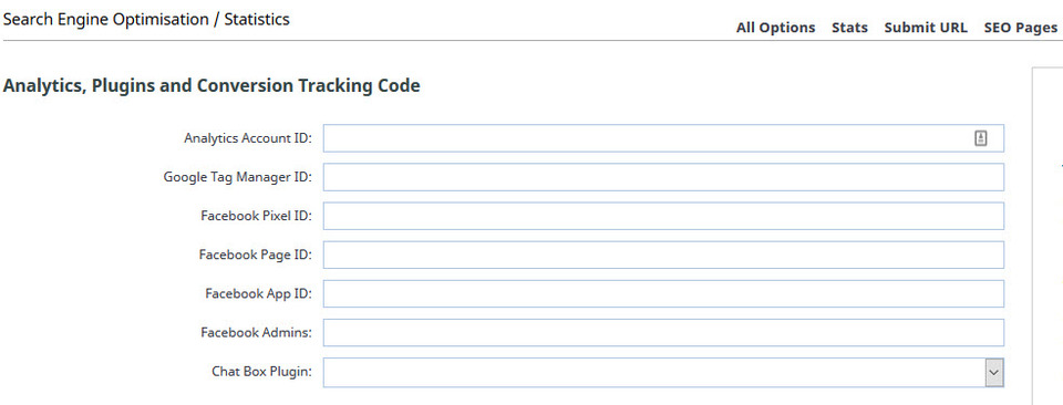 Upon signing up for an account with Google Analytics, you will receive a tracking code to install in your website. You can add this code by going to SEO - Analytics/AdWord Tracking and entering it in the box marked Analytics Account ID and clicking Publish.