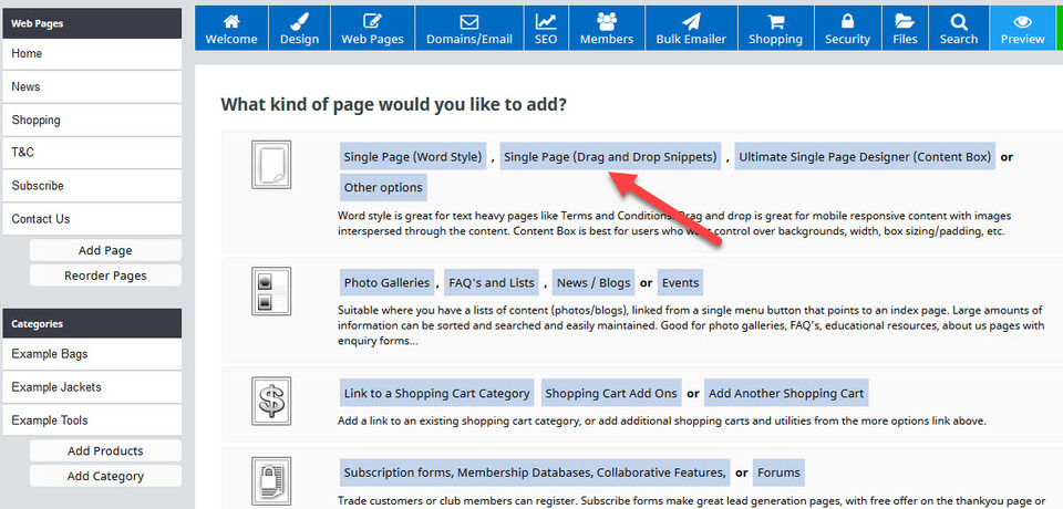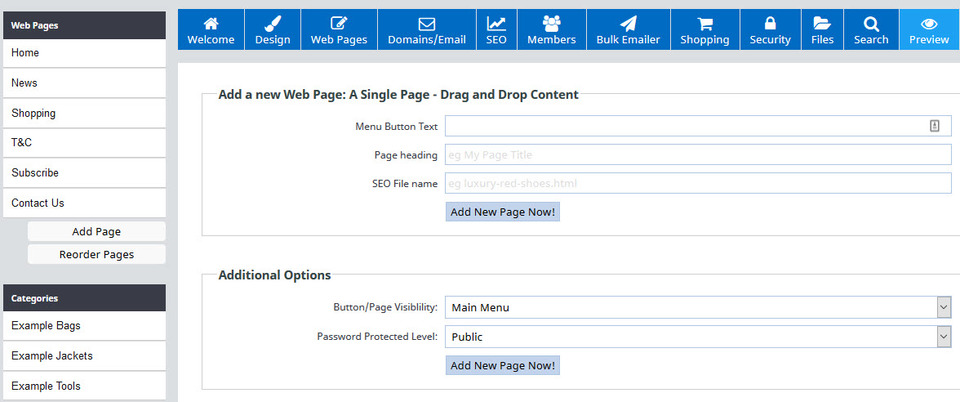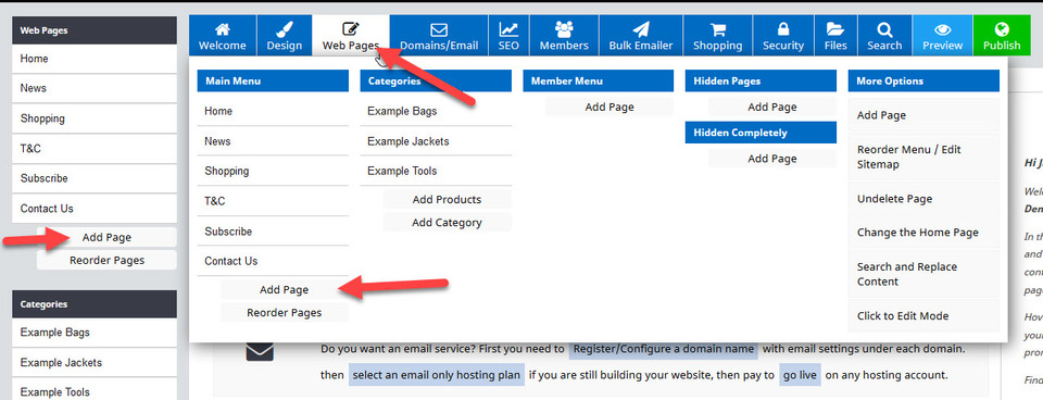 To add a new page to your website, click upon the Add Page button which can be found on the left hand side of the Welcome Dashboard, or by clicking on the Web Pages button and selecting Add Page.