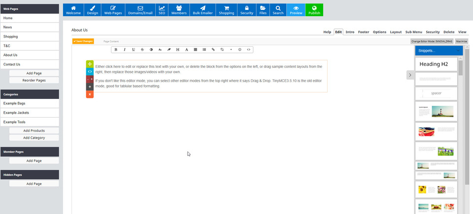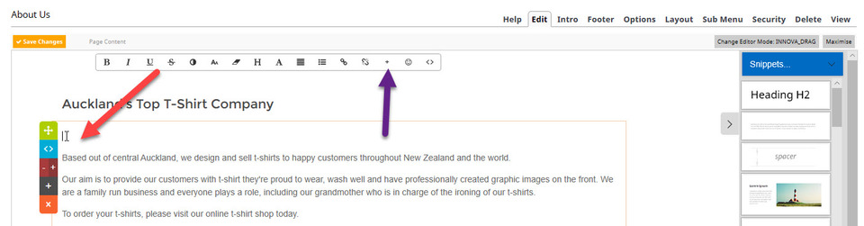 As the About Us page is open, we can add sub headings and paragraph text. You can do this either by clicking inside the paragraph text box which is already in the middle of the page by default, or by selecting a snippet from the right hand side column which contains the type of text you would like.