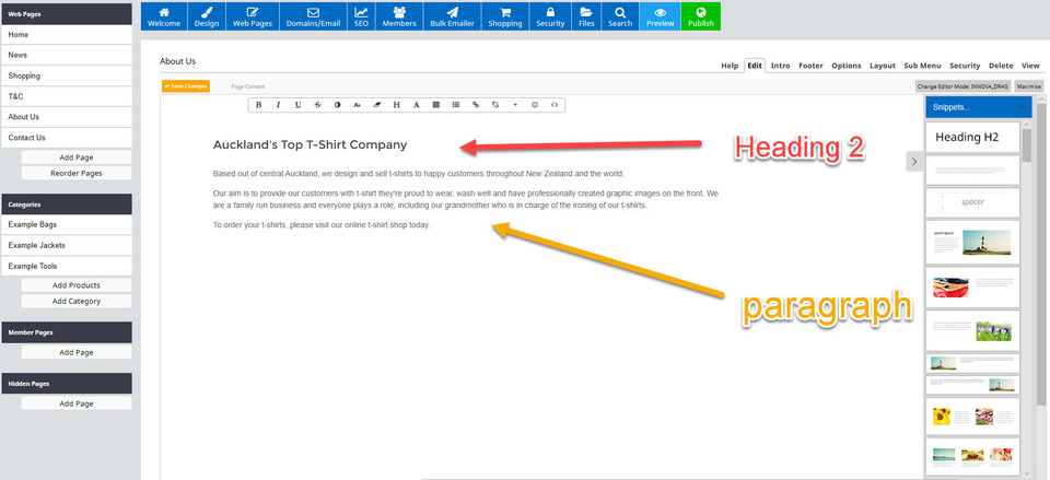 We added some text to the existing paragraph snippet box, and then clicked on and dragged over the Heading H2 snippet box above it. We then added a title to that heading snippet, as in this image: