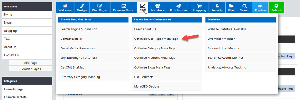 There are two ways you can change the page title, or Heading 1 (h1). First you can follow the instructions in the previous step of renaming a page. Or secondly, you can open the SEO tab from the blue menu, then select Optimise Web Pages Meta Tags.