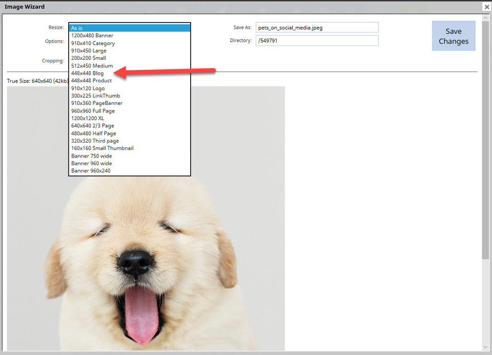 The Image Wizard in the CMS will open your image ready for editing, if required. It will show you the true size of your image as it is now, the existing file name it has and some options to crop, rotate, resize and convert to JPG. We are going to resize this image to fit on the About Us page. Click on the drop down arrow for the Resize box, and select the image size 448x448 Blog option. Change the file name if required, then click Save Changes.