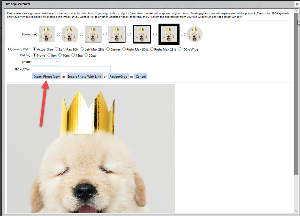 Another box will open which allows you some editing options for your image, including its position, border and padding around the image. For this example, we will go with the default border, alignment and padding, and then click the blue Insert Photo Now button.