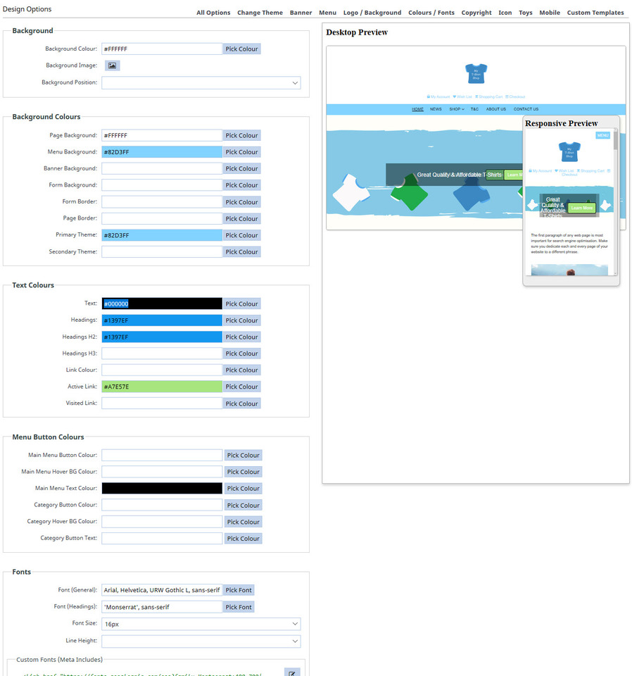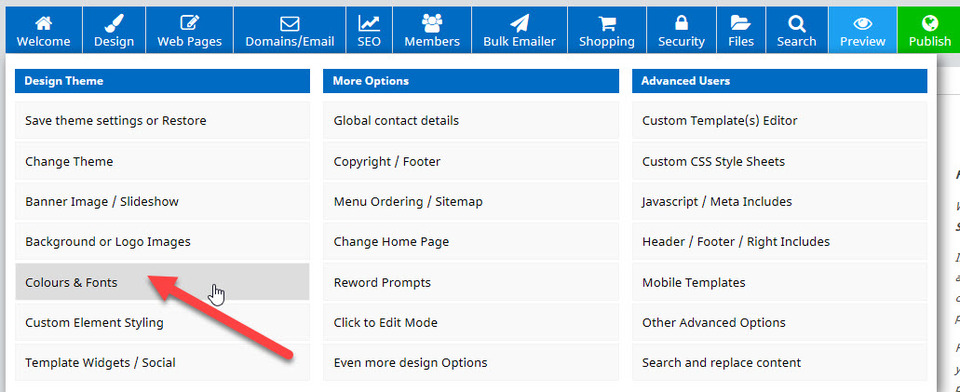 Changing the general colours for your entire website is done via the Design Tab, then selecting the Colours and Fonts option. Once on the Design Options page, you will be able to edit the colours for many different areas on your website.