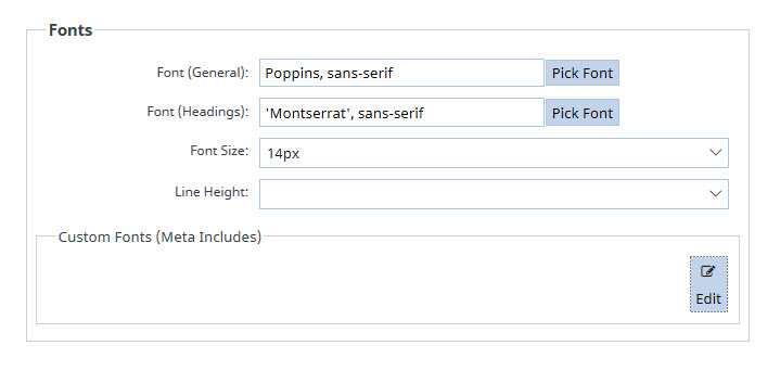 Scroll down the page until you see the Fonts box options. Here you will be able to edit the: General Font, Heading Font, Font Size and Line Height.