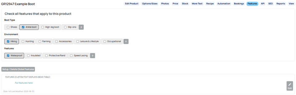 Example above of choosing the features for a particular product under the features tab.