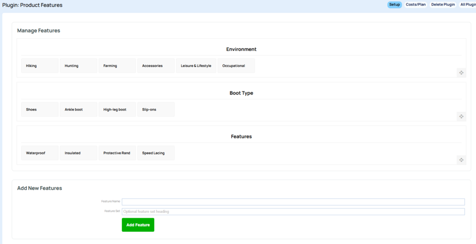 - Add "Product Features" plugin. Ecommerce > Scroll down to plugins > Find and add plugin.