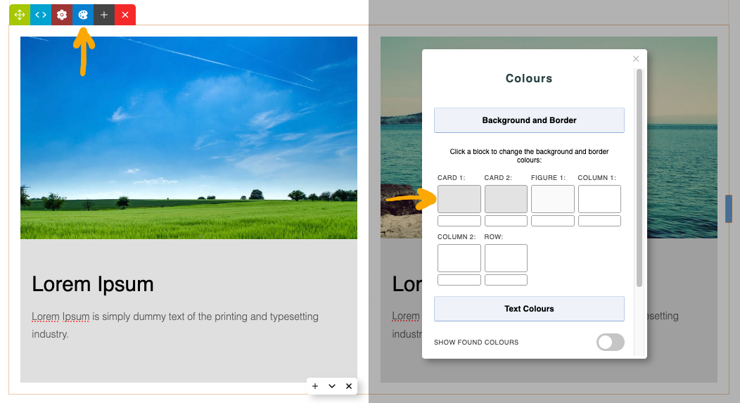 • Click the BLUE PALETTE  icon found in the Row Tools top-left of the snippet