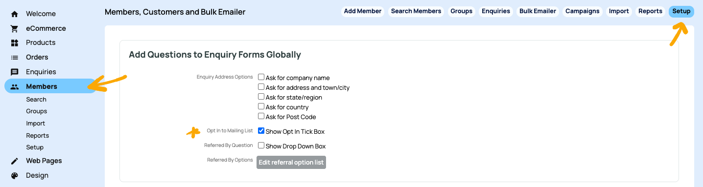 - Click SETUP either by the dropdown that appears under menu, or the small tabs top-right.