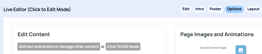 To enter Click to Edit mode - navigate to any page you wish to view and click the OPTIONS tab top-right. The Click to Edit button can be found near the top of the page.