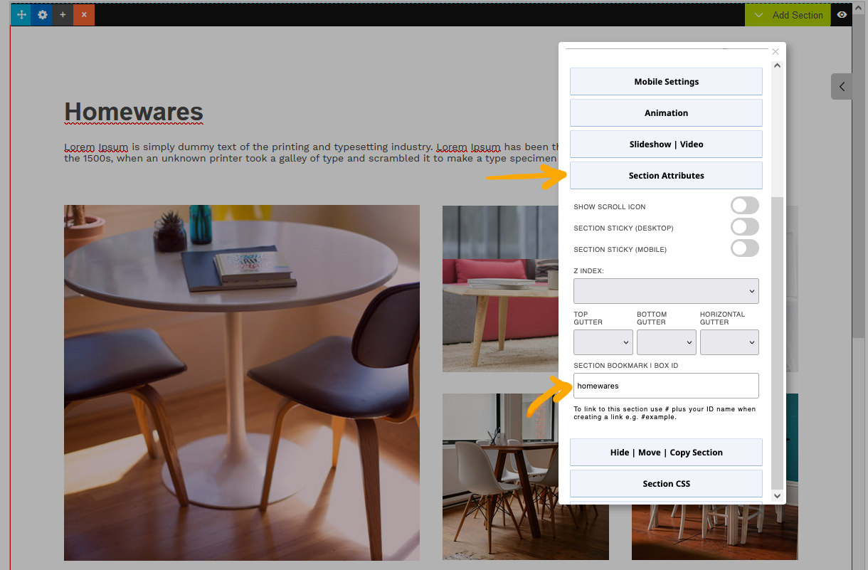 Click on the SECTION ATTRIBUTES panel to open the settings, then enter a unique custom ID name in the SECTION > BOX ID field.