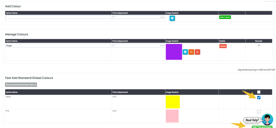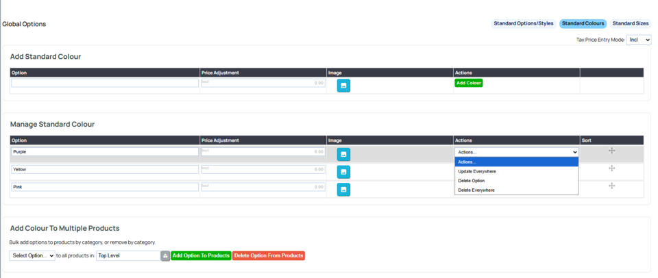Click these to bulk add or remove global colours and add to or delete from all products in a selected category.