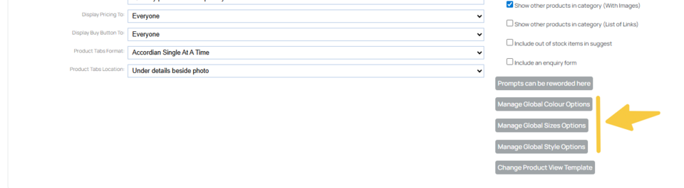 In the “View Product Page Options” screen, on the right side, there are buttons for each global option (e.g. global sizes, global colours, global styles).
