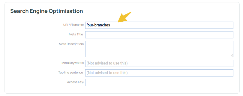 Scroll down to the SEARCH ENGINE OPTIMISATION area and add a custom filename, no spaces or special characters allowed.