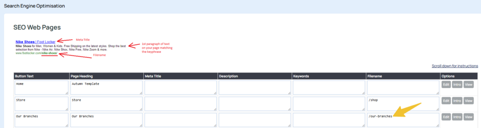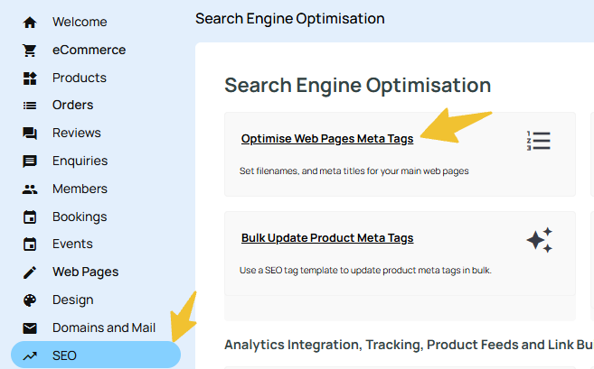 Change filenames in bulk via the main SEO button, then click the OPTIMISE WEB PAGES META TAGS area.