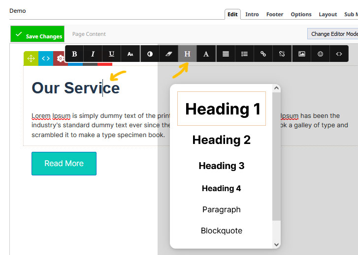 Click into or select to highlight the text you would like to change, then choose a new text format via the FORMAT dropdown in the toolbar.