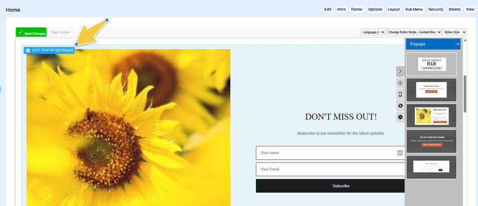The screen above shows the snippet area where you can find the pop ups and the edit pop up settings button.