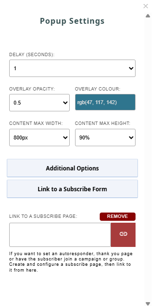 Open the Settings button (top left of the popup editor). Set your text and adjust popup settings as needed. In the Link to a Subscribe Form field, connect the popup to your subscription form.