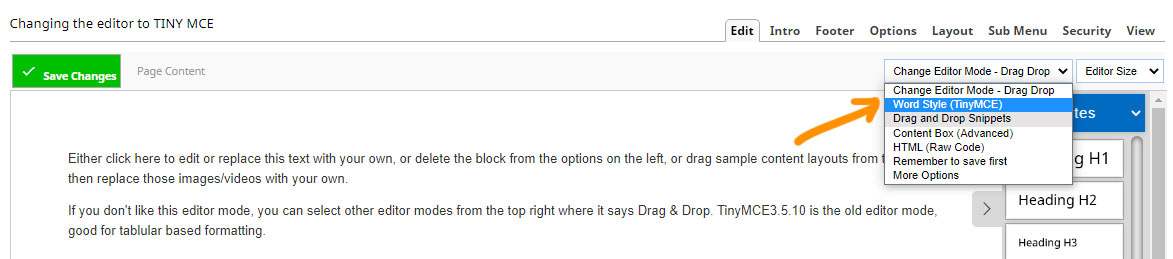 You can change from Drag-drop to the Word Style (Tiny MCE) editor using the Change Editor Mode dropdown.